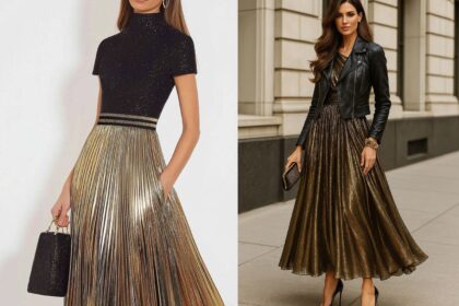 Black & gold look: Πώς να συνδυάσετε διάφανο τοπ με χρυσή πλισέ φούστα