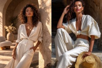Κομψό σύνολο σε ουδέτερους τόνους: Wide leg παντελόνα και μπλούζα με v λαιμόκοψη | resort chic style 2026