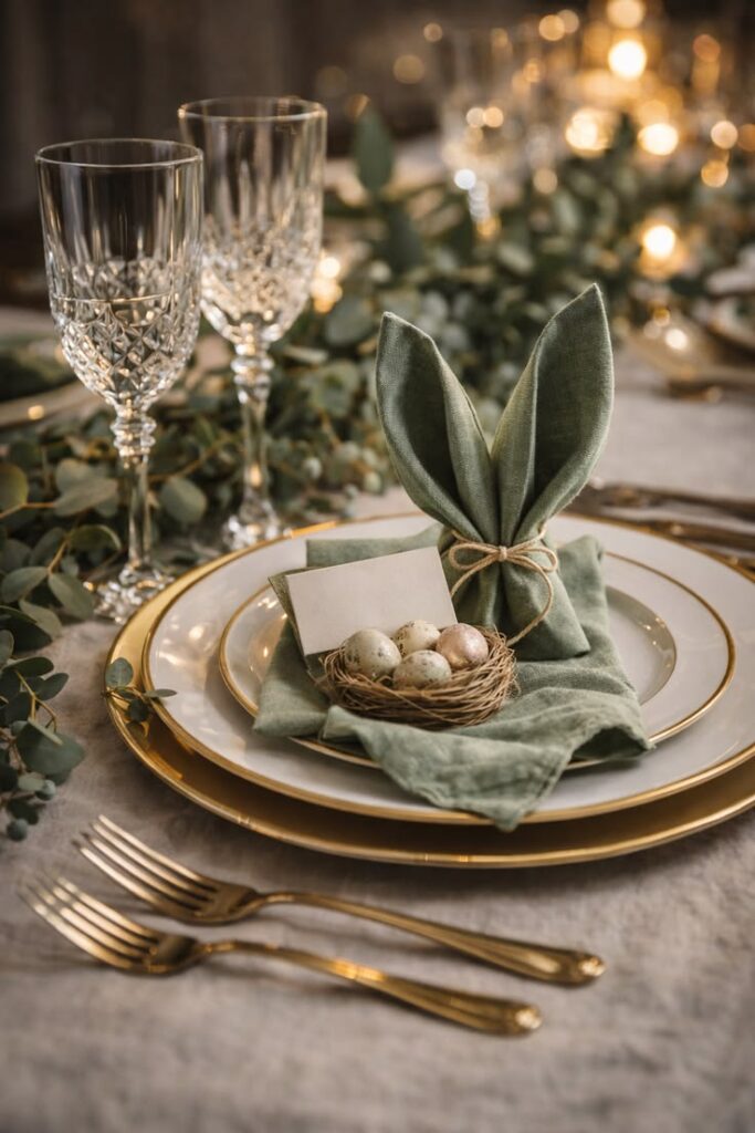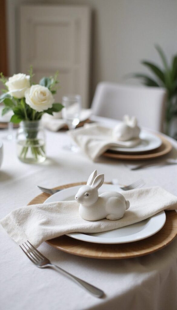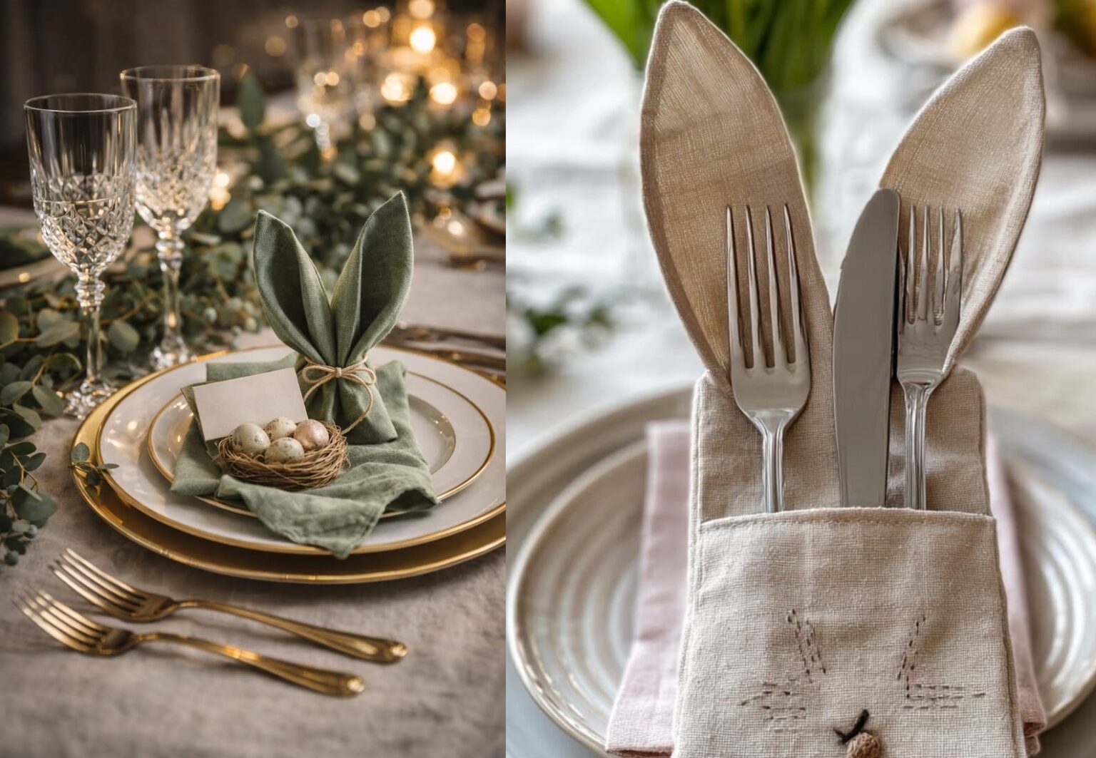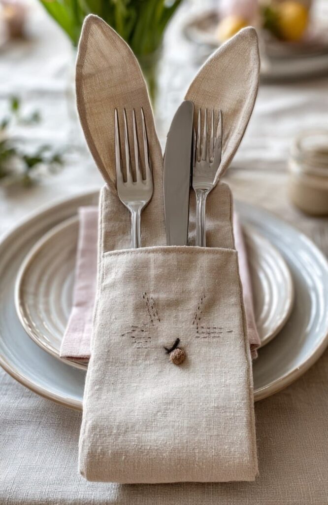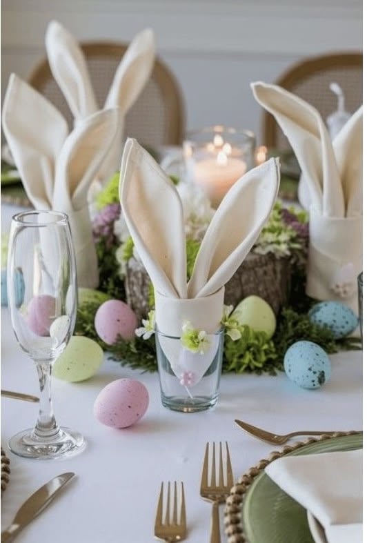 Φτιάξτε δαχτυλίδια για τις πετσέτες του φαγητού χρησιμοποιώντας σύρμα ντυμένο με λευκή τσόχα ή λινό ύφασμα, σχηματίζοντας αυτιά λαγού.