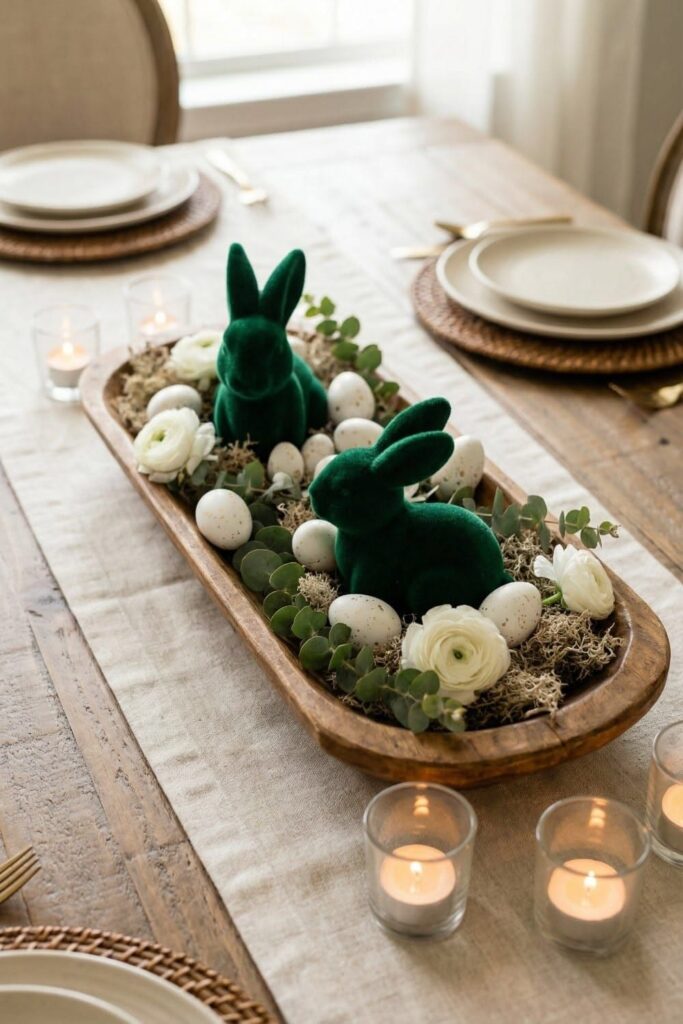 Δημιουργήστε μια σύνθεση κατά μήκος του τραπεζιού χρησιμοποιώντας αληθινό βρύο (moss) και τοποθετήστε ανάμεσα λευκές ρανούγκουλες σε μικρά γυάλινα βαζάκια. Προσθέστε χειροποίητα λαγουδάκια από τσόχα σε γήινες αποχρώσεις για μια παραμυθένια αίσθηση.