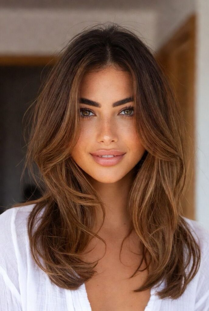 Αν έχετε φυσικά σκούρα καστανά μαλλιά και δεν θέλετε να γίνετε ξανθιά, αυτή είναι η λύση. Κρατάμε τη βάση σκούρα (για να καλυφθούν τα λευκά) και “ζωγραφίζουμε” ανταύγειες στο χρώμα της ζεστής καραμέλας γύρω από το πρόσωπο και στις άκρες. Γιατί λειτουργεί: Η τεχνική του Balayage δίνει βάθος και κίνηση, κάνοντας τα μαλλιά να φαίνονται πιο πυκνά, ενώ η καραμέλα μαλακώνει τις γωνίες του προσώπου.