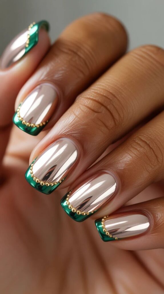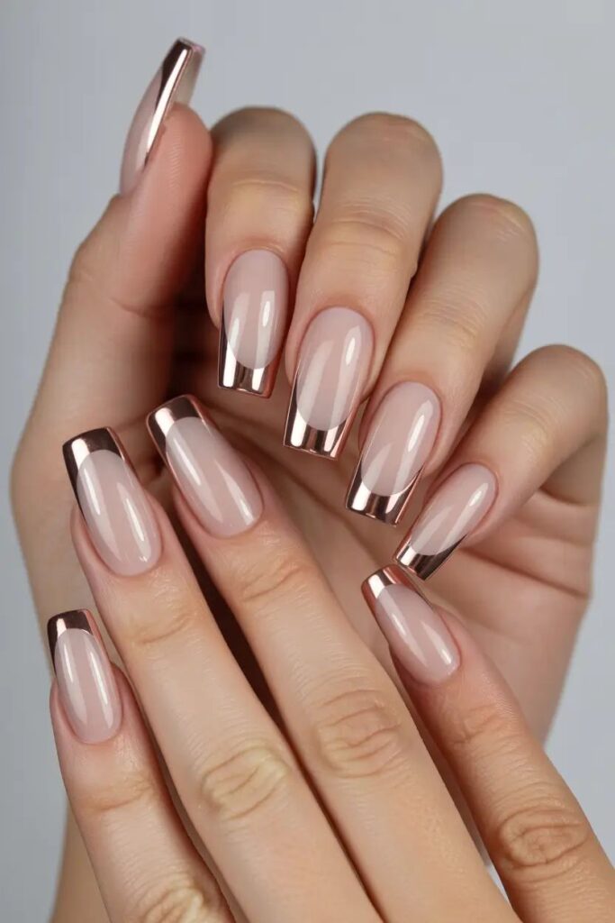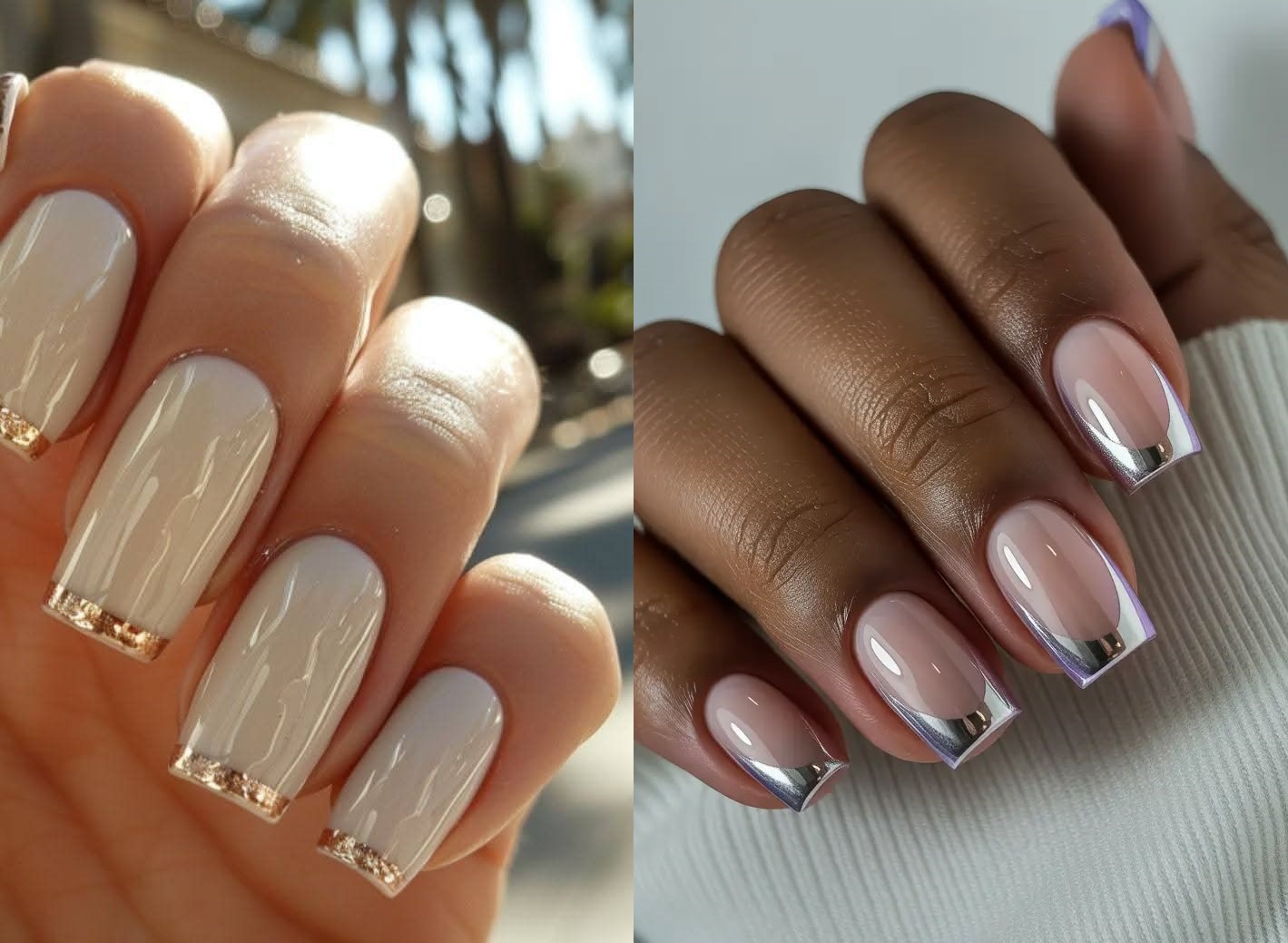 - Chrome tips: Η τάση των “Glazed Donut” νυχιών συναντά το γαλλικό. Οι άκρες είναι μεταλλικές (ασημί ή χρυσό) πάνω σε μια διάφανη βάση.