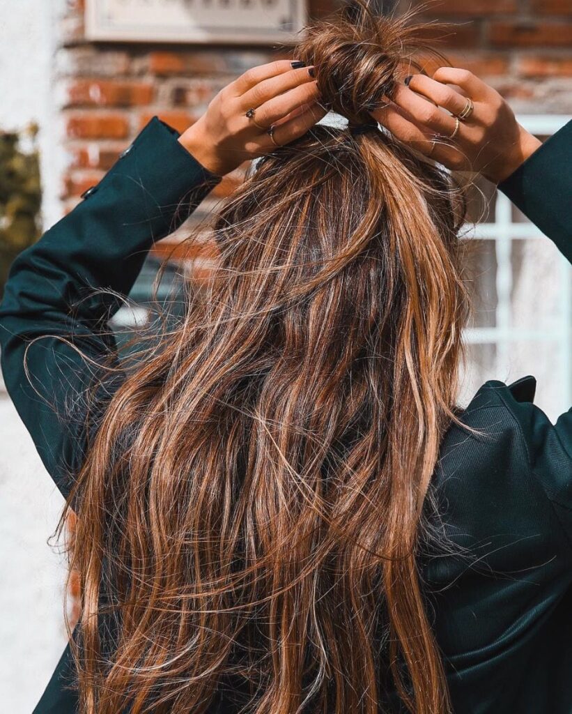 - High-gloss ponytail: Μια ψηλή, λεία αλογοουρά που αναδεικνύει το μήκος και τη λάμψη της τρίχας.