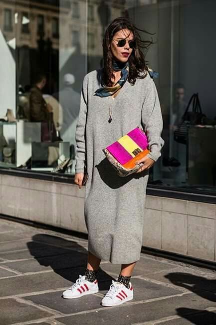 Αν υπάρχει outfit που λέει “είμαι άνετη αλλά δεν με αφήνει αδιάφορη”, είναι αυτό. Ένα πλεκτό φόρεμα σε ουδέτερο τόνο (γκρι, μπεζ, χακί) με λευκά sneakers είναι το απόλυτο weekend look. Πρόσθεσε ένα trench coat και μια crossbody τσάντα για να ολοκληρώσεις το σύνολο με κομψότητα.