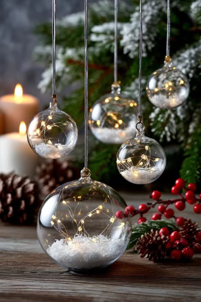 Γέμισε διάφανες μπάλες με αποξηραμένα άνθη, γκλίτερ, κανέλα ή μικρές φωτογραφίες αγαπημένων προσώπων. Είναι μια τρυφερή και δημιουργική πινελιά που φέρνει ζεστασιά στη διακόσμηση – και γίνεται και υπέροχο χειροποίητο δώρο.