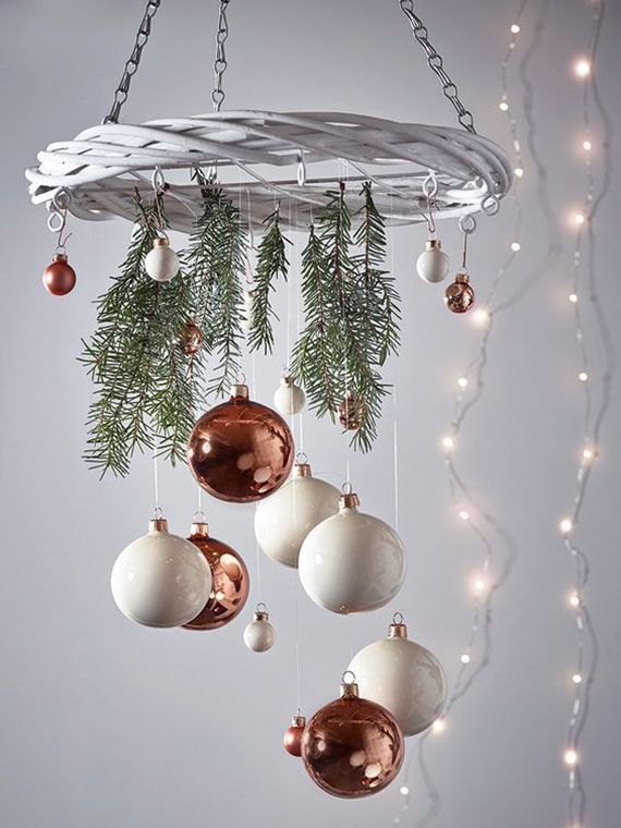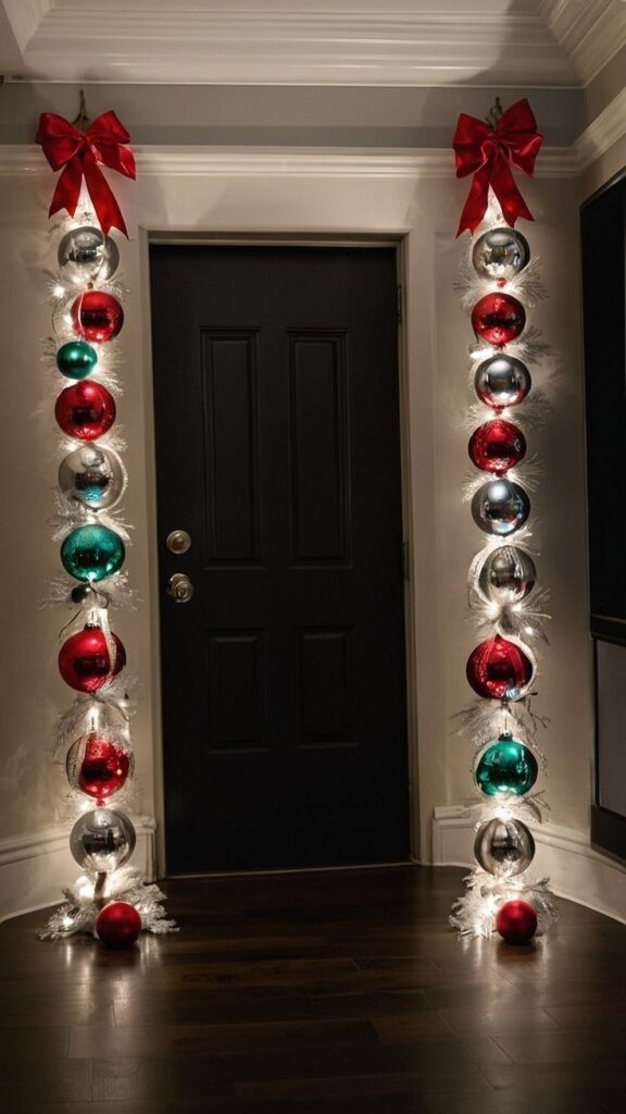 Χρησιμοποίησε διάφανο πετονιά ή λεπτές κορδέλες και κρέμασε μπάλες σε διαφορετικά ύψη πάνω από το τραπέζι σου. Επίλεξε παλέτα σε χρυσό και λευκό για κομψό αποτέλεσμα ή κόκκινο και πράσινο για πιο παραδοσιακό. Θα δημιουργήσεις ένα αιωρούμενο γιορτινό “πολύφωτο” που εντυπωσιάζει.