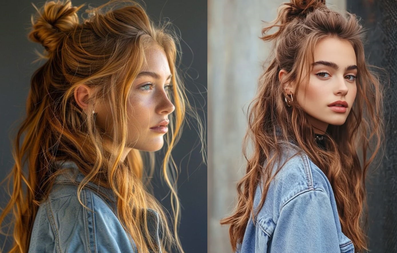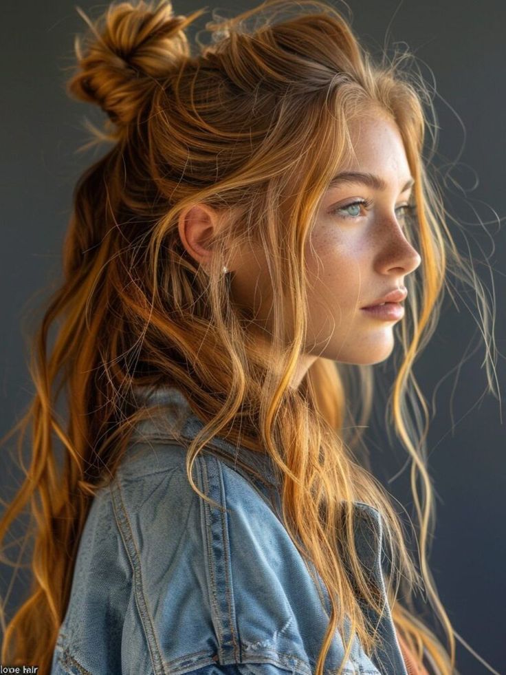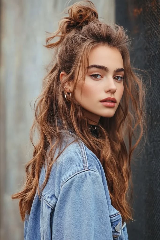 - Το look: Τα μισά μαλλιά πιασμένα σε έναν πρόχειρο κότσο ψηλά, ενώ τα υπόλοιπα πέφτουν ελεύθερα και ατημέλητα.