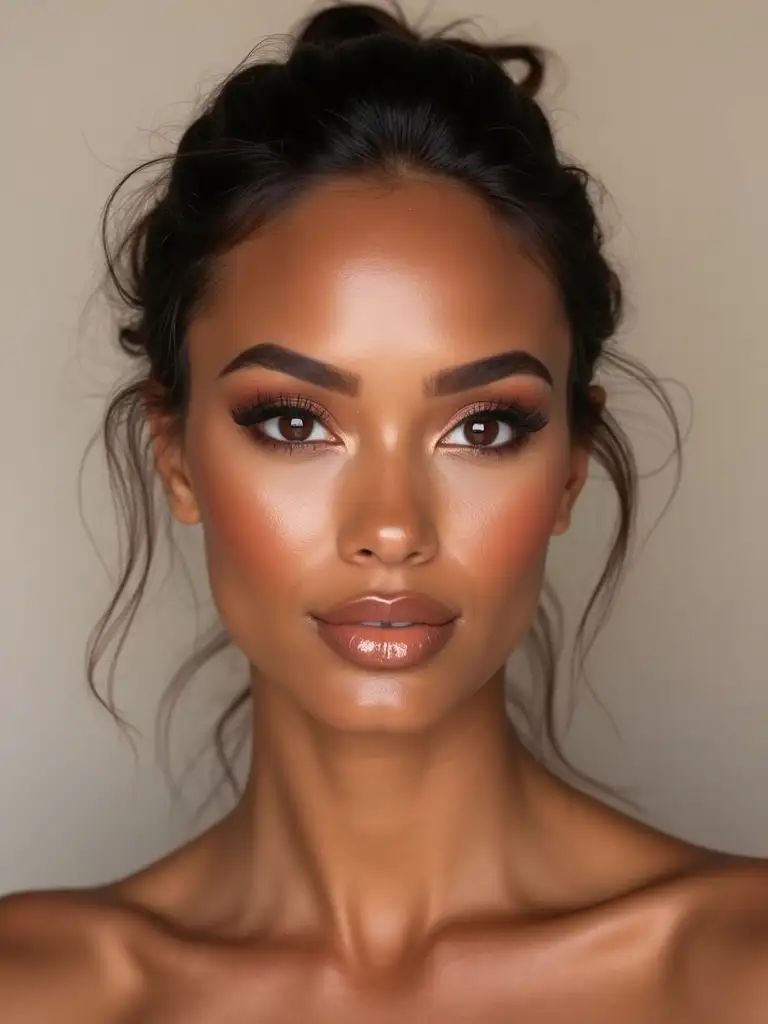 Στους πλούσιους τόνους δέρματος, το contouring με καφέ-χρυσές αποχρώσεις είναι απαραίτητο για να δώσει σχήμα και φως.