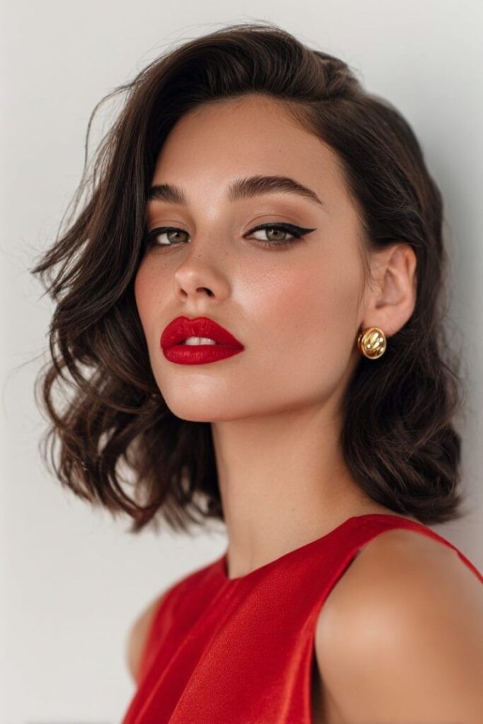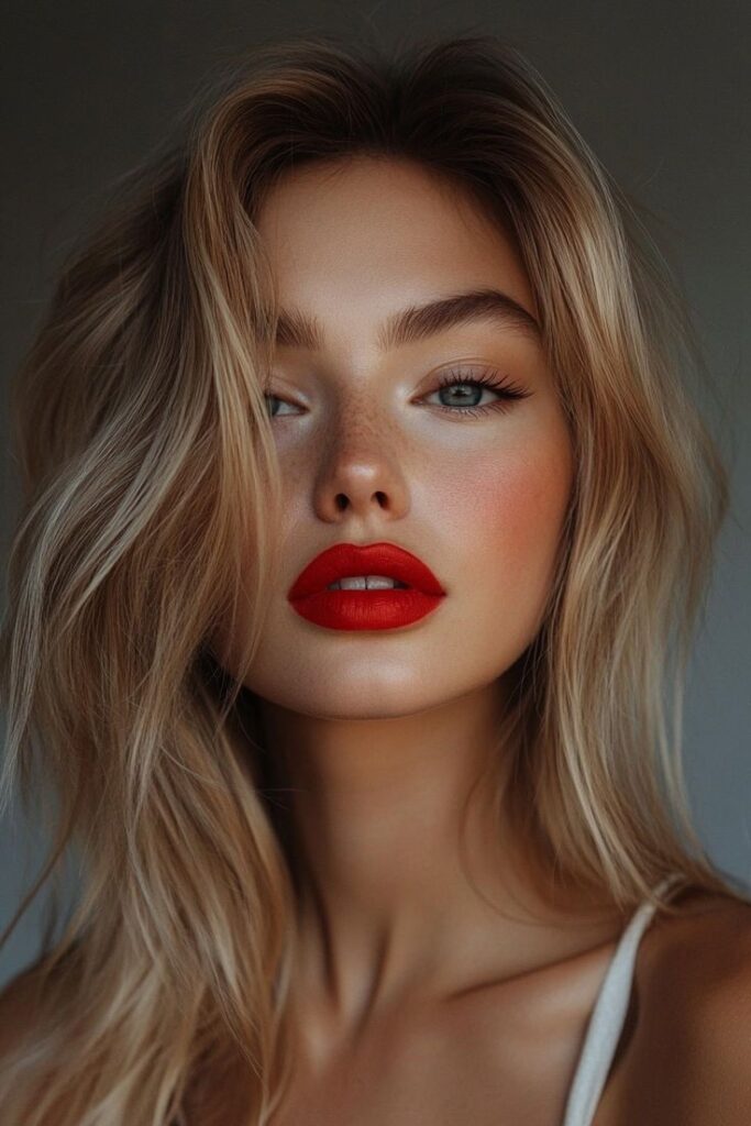 • Γιατί λειτουργεί: Το κόκκινο κραγιόν αποτελεί το απόλυτο “point of interest”, τραβώντας την προσοχή αμέσως στο πρόσωπο.
