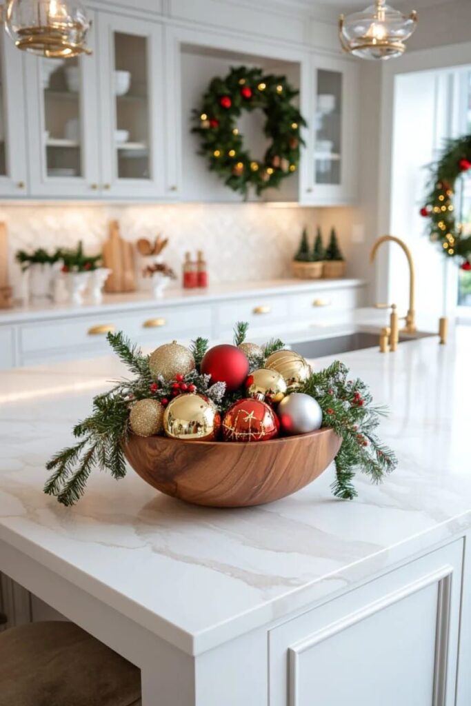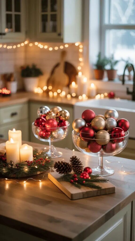 Extra tip: Αν έχεις ανοιχτόχρωμη κουζίνα, δοκίμασε πράσινα στεφάνια με κόκκινη κορδέλα· αν είναι σκούρα, προτίμησε λευκές ή ασημί για πιο φωτεινό αποτέλεσμα.