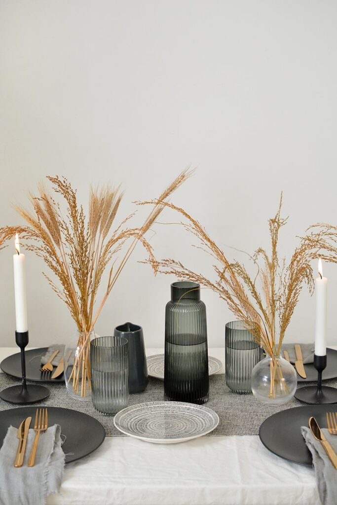- Ποτήρια διαφορετικού ύψους: Νερού, κρασιού, σαμπάνιας – ακόμη κι αν δεν τα χρησιμοποιήσεις όλα, δίνουν κομψότητα.