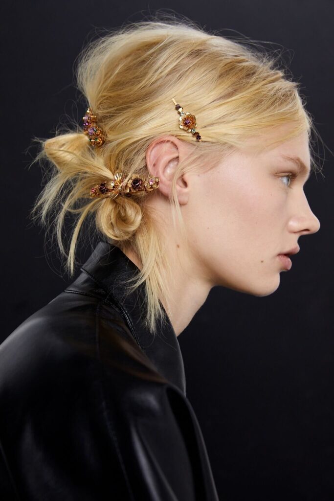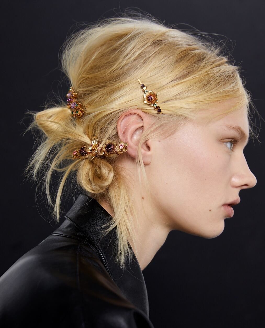 1. Μεταλλικές λεπτομέρειες – Από χρυσά κλιπ μέχρι ασημένιες καρφίτσες, το μέταλλο επιστρέφει δυναμικά. Πρόσθεσέ το σε ένα sleek σινιόν ή ένα χαμηλό κότσο για διακριτική λάμψη που απογειώνει ακόμα και το πιο απλό outfit.