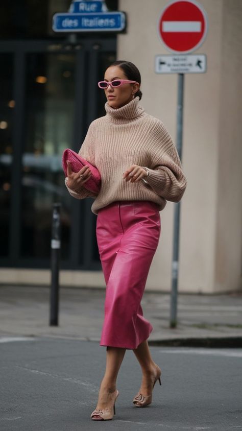 Ένα από τα πιο αγαπημένα σύνολα για το 2026. Συνδυάστε μια σατέν midi φούστα σε χρώμα σαμπανί με ένα oversized πλεκτό πουλόβερ σε κρεμ απόχρωση.