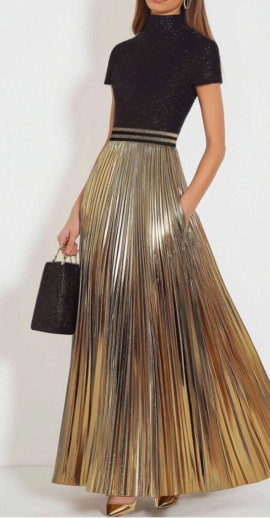 Στη μόδα του 2026, η τάση του “Contrast Dressing” (το παιχνίδι των αντιθέσεων) κυριαρχεί. Ο συνδυασμός του μαύρου με το χρυσό είναι διαχρονικός, αλλά η φετινή εκδοχή του εστιάζει στις υφές: η αιθέρια διαφάνεια στα μανίκια συναντά τη γεωμετρική πειθαρχία της πλισέ φούστας, δημιουργώντας μια σιλουέτα που κολακεύει κάθε σωματότυπο.