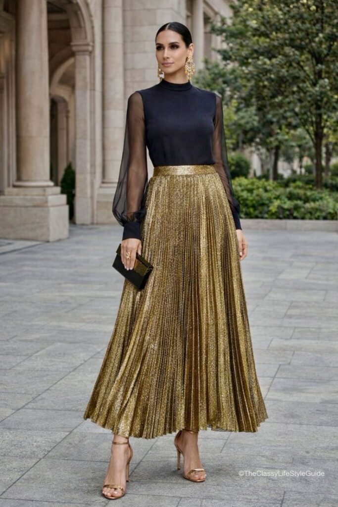 Ο συνδυασμός ενός μαύρου τοπ με διάφανες μανίκια (sheer-sleeve) και μιας χρυσής πλισέ μάξι φούστας αποτελεί την επιτομή της σύγχρονης βραδινής κομψότητας για το 2026. Πρόκειται για ένα σύνολο που ισορροπεί ανάμεσα στο μυστήριο και τη λάμψη, προσφέροντας μια εμφάνιση που αποπνέει πολυτέλεια χωρίς να χρειάζεται υπερβολική προσπάθεια.