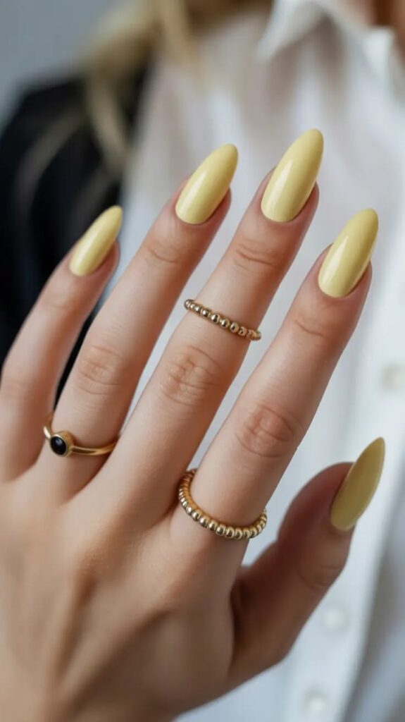 Μια απλή, ομοιόμορφη στρώση butter yellow σε κοντό, τετράγωνο σχήμα ή σε “soft almond”.