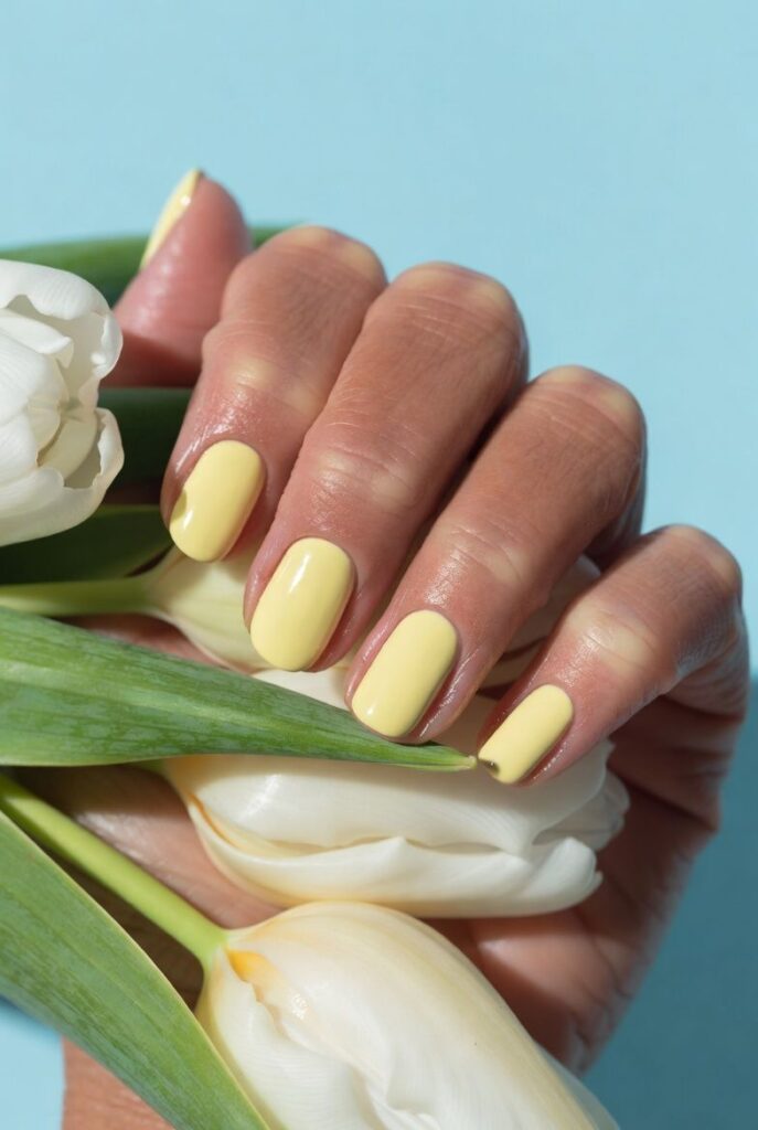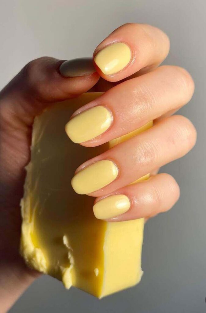 Το butter yellow (το κίτρινο του βουτύρου) είναι αναμφισβήτητα το “it” χρώμα για την άνοιξη του 2026. Όταν συνδυάζεται με κοντά, στρογγυλά νύχια (short round), το αποτέλεσμα είναι η επιτομή της ανοιξιάτικης αισθητικής: καθαρό, δροσερό και ανεπιτήδευτα κομψό.