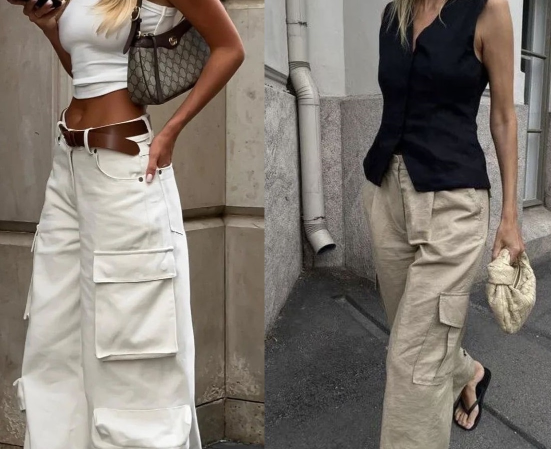 - Αναβαθμισμένα υφάσματα: Φέτος ξεφεύγουμε από το σκληρό καμβά. Βλέπουμε cargo παντελόνια από σατέν, μετάξι, λεπτό λινό ακόμα και τεχνικά υφάσματα που πέφτουν αέρινα στο σώμα.