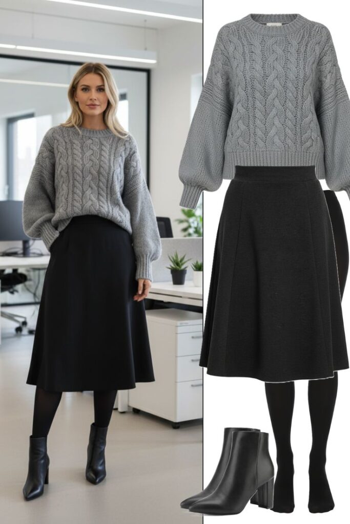 3. Το “Feminine & Cozy”: Midi Φούστα + Χοντρό Πλεκτό