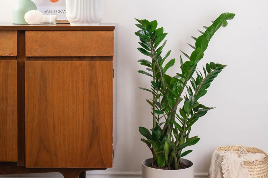 2. ZZ Plant (Ζαμιοκούλκας): Με τα γυαλιστερά, σκούρα πράσινα φύλλα του, δείχνει υπέροχο και είναι σχεδόν άφθαρτο. Μπορείς να το ξεχάσεις για εβδομάδες και αυτό θα συνεχίσει να μεγαλώνει.