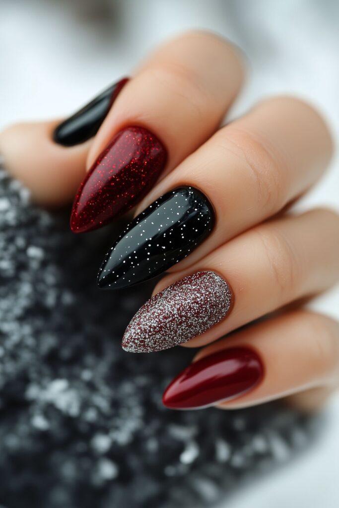 Ο χειμώνας είναι και η εποχή των γιορτών, άρα λίγη λάμψη είναι απαραίτητη. Το κόκκινο, το χρυσό και το ασημί δεν φεύγουν ποτέ από τη μόδα, ειδικά όταν συνδυάζονται με πιο σκούρες βάσεις. Αν θες να ξεχωρίσεις, δοκίμασε μπορντό με λεπτομέρειες σε glitter ή nude με μεταλλικά σχέδια – μια ισορροπία ανάμεσα στο διαχρονικό και το μοντέρνο.
