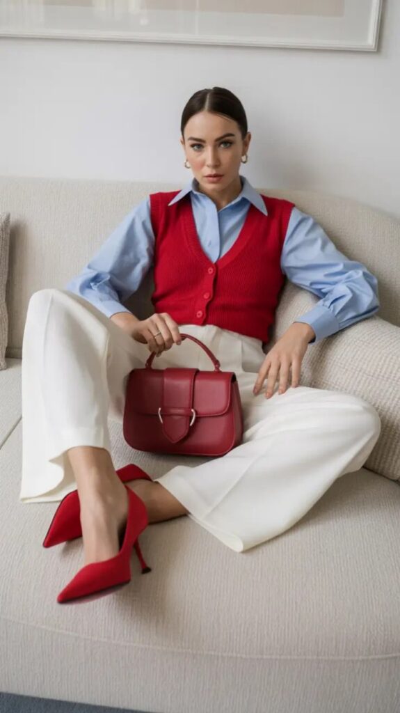 - Η ιδέα: Ένα total neutral look (μπεζ/γκρι) με μια εντυπωσιακή κόκκινη τσάντα ή κόκκινα flats.