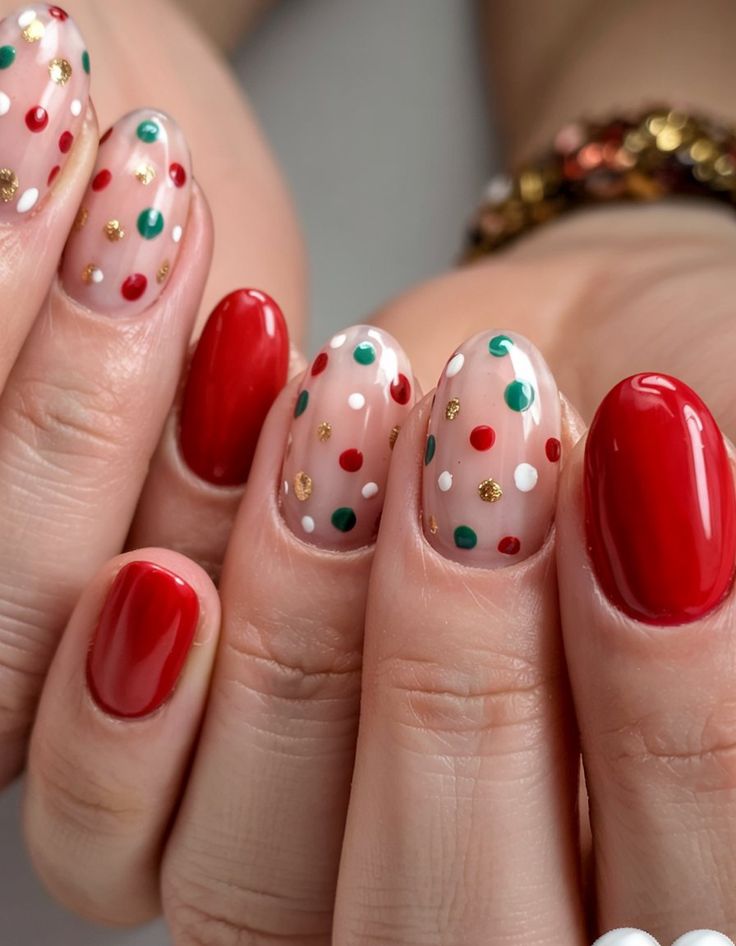 Στη σύγχρονη εκδοχή των γιορτινών νυχιών, οι nude και milky αποχρώσεις έχουν κερδίσει έδαφος. Τα minimalist Christmas nails με διάφανη ή γαλακτερή βάση και μικροσκοπικά χρυσά στοιχεία δημιουργούν ένα αποτέλεσμα που συνδυάζει κομψότητα και γιορτινή διάθεση. Ένα λεπτό χρυσό αστέρι, μια μικρή χιονονιφάδα, μια χρυσή τελεία στο κέντρο του νυχιού ή micro-glitter διάσπαρτο στην επιφάνεια αρκεί για να δώσει festive χαρακτήρα χωρίς να βαραίνει.