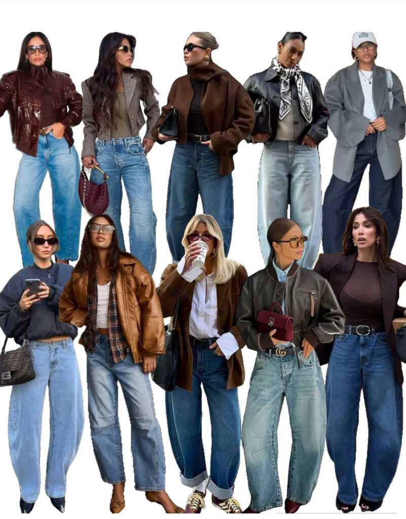 2. Barrel Leg & Horseshoe (Το “βαρελάκι”) Ίσως το φοβήθηκες πέρυσι, αλλά φέτος ήρθε για να μείνει. Είναι εκείνο το τζιν που ανοίγει καμπυλωτά στο πλάι (σαν παρένθεση) και στενεύει λίγο στον αστράγαλο.