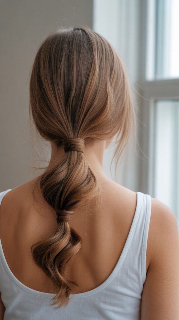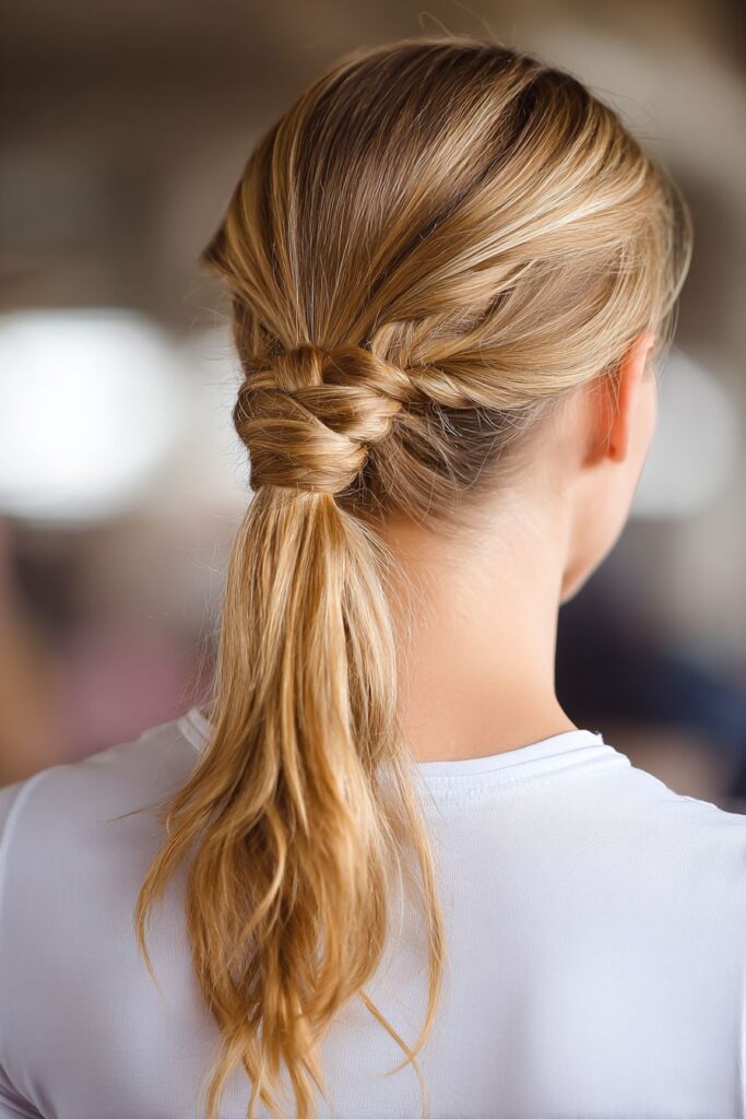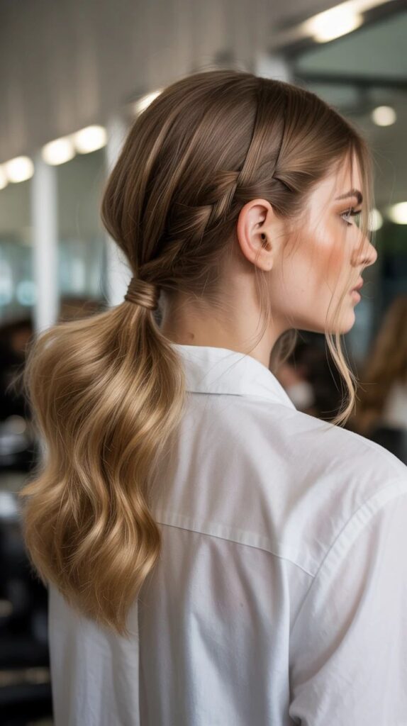 - Η λεπτομέρεια: Πιάσε μια πολύ ψηλή και λεία κοτσίδα. Τύλιξε ένα λεπτό ύφασμα ή μια κορδέλα γύρω από το λαστιχάκι, αφήνοντας τις άκρες να πέφτουν μαζί με τα μαλλιά σου.