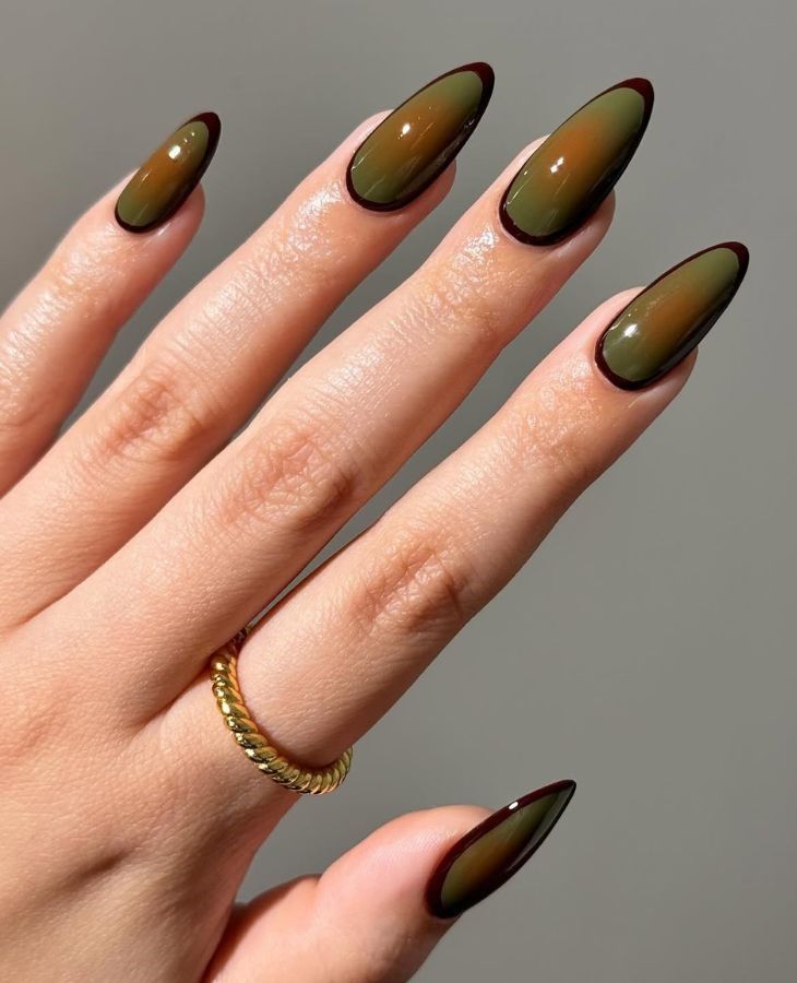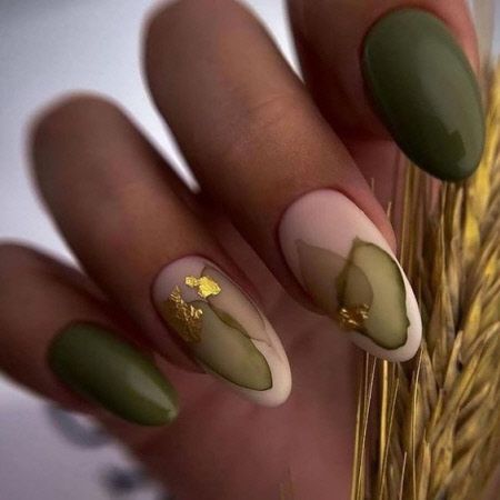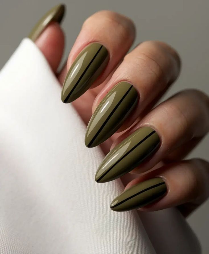 Το ελαιοπράσινο είναι ένα από τα πιο «ήσυχα» αλλά ταυτόχρονα πλούσια και βαθιά χρώματα της χρωματικής παλέτας. Θυμίζει φύση, ισορροπία και γήινη πολυτέλεια. Είναι μια απόχρωση που δείχνει υπέροχη σε κάθε τόνο δέρματος – είτε έχεις ανοιχτόχρωμη, είτε πιο μεσογειακή επιδερμίδα. Και όταν συνδυάζεται με χρυσό, αποκτά αυτή την πολυδιάστατη λάμψη που κάνει τα νύχια σου να φαίνονται σαν μικρά κοσμήματα.