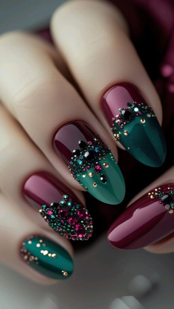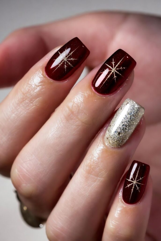 Τα golden French tips είναι απόλυτη τάση για φέτος. Δεν είναι το παλιό, έντονο χρυσό· είναι μια λεπτή, σχεδόν ψιθυριστή χρυσή γραμμή που γλιστρά πάνω από μια nude ή deep βάση, δίνοντας στο νύχι την αίσθηση κοσμήματος. Το ίδιο ισχύει και για τα μεταλλικά swirls: λεπτές χρυσές ή ασημένιες καμπύλες που θυμίζουν χριστουγεννιάτικες κορδέλες.