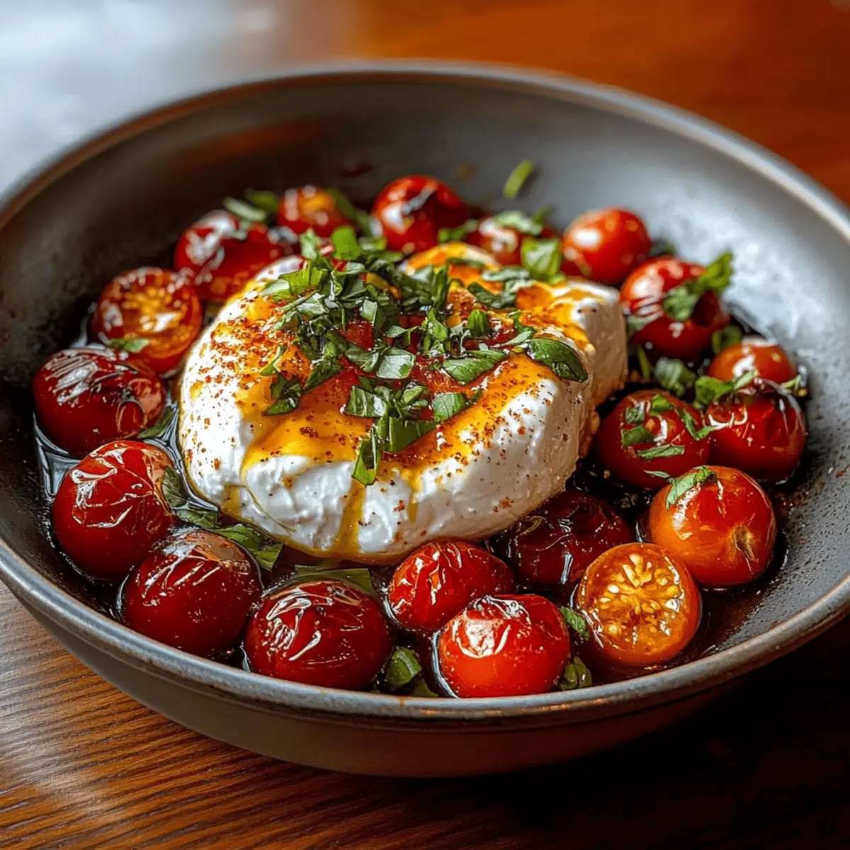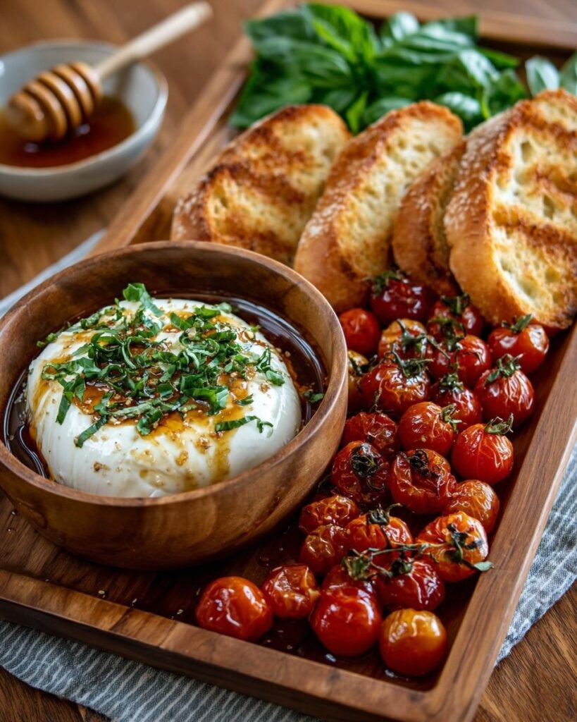 Η κουζίνα μας επιστρέφει στις απλές αλλά ποιοτικές απολαύσεις. Αυτή η πιατέλα δεν είναι απλώς ένα ορεκτικό, είναι η αποθέωση του «βουτήματος». Φανταστείτε ζεστό, φρυγανισμένο ψωμί να βουτάει μέσα στην καρδιά μιας φρέσκιας μπουράτας, η οποία έχει περιλουστεί με ένα αρωματικό, πικάντικο μέλι και γλυκά, καραμελωμένα ντοματίνια.