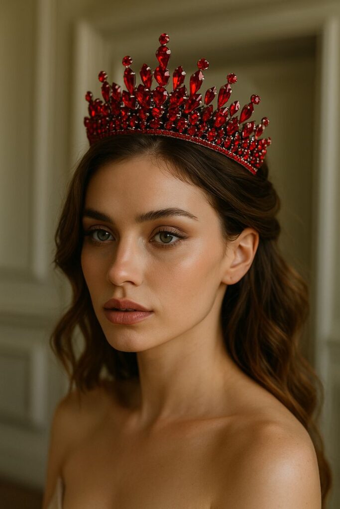 - Η βασιλική κορώνα: Για εκείνες που θέλουν να νιώσουν σαν βασίλισσες (είτε πρόκειται για νύφες, είτε για την εορτάζουσα μιας βάπτισης). Μια κορώνα με κόκκινες πέτρες ή σμάλτο δημιουργεί ένα επιβλητικό αποτέλεσμα που αποπνέει αυτοπεποίθηση.