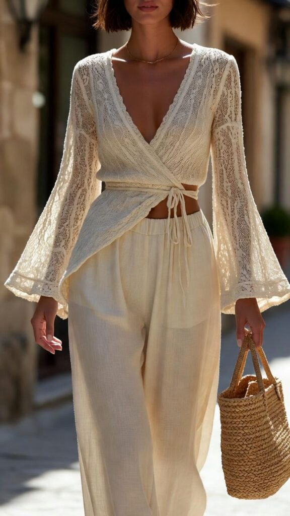 Το Resort Chic το 2026 επαναπροσδιορίζει την έννοια της «ήσυχης πολυτέλειας» (quiet luxury), συνδυάζοντας την απόλυτη άνεση με την αριστοκρατική φινέτσα. Ένα σύνολο σε ουδέτερους τόνους (neutral palette) με πρωταγωνιστές μια παντελόνα με φαρδιά μπατζάκια (wide leg pants) και μια μπλούζα με V λαιμόκοψη (V-neck blouse) αποτελεί την επιτομή του διαχρονικού στυλ. Είναι η εμφάνιση που μπορεί να σας συνοδεύσει από ένα πρωινό γεύμα δίπλα στη θάλασσα μέχρι ένα κοκτέιλ πάρτι σε ένα πολυτελές θέρετρο.