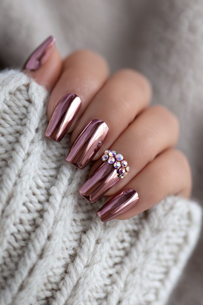 - Ένα μόνο accent nail με minimal διάταξη κρυστάλλων.