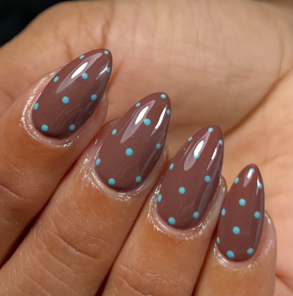 1. Dots παντού: Με την άκρη από ένα τσιμπιδάκι ή μια καρφίτσα, μπορείς να φτιάξεις μικρές τελείες πάνω σε ένα ουδέτερο βερνίκι. Συνδύασε διαφορετικά μεγέθη για πιο καλλιτεχνικό αποτέλεσμα.