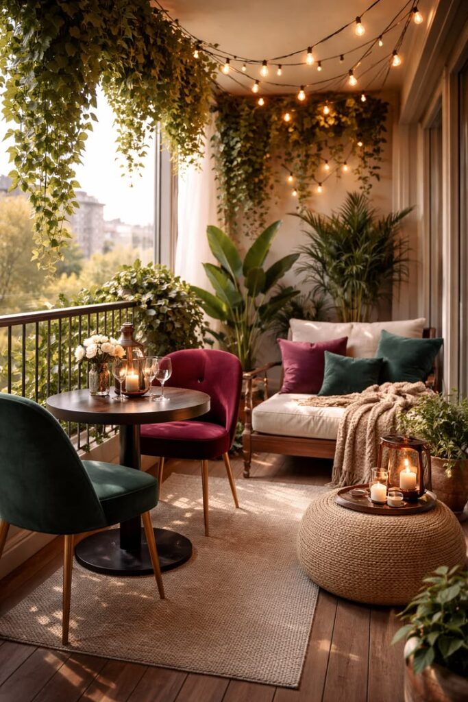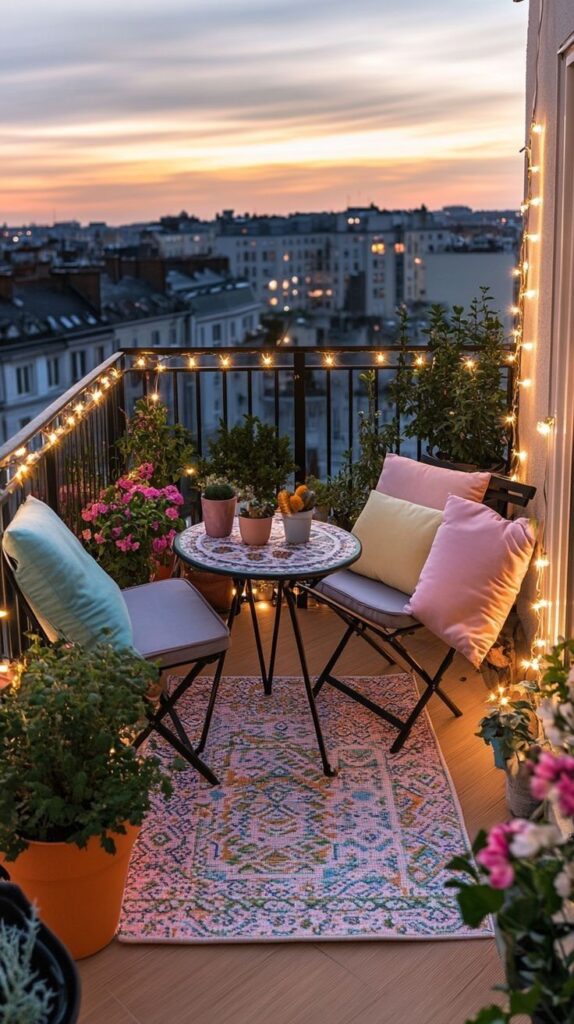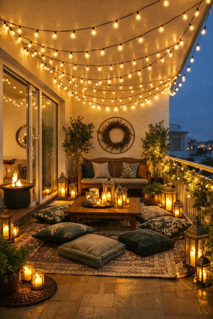 - String lights (γιρλάντες): Κρεμάστε φωτάκια με θερμό φως (warm white) κατά μήκος του κάγκελου ή στην οροφή.