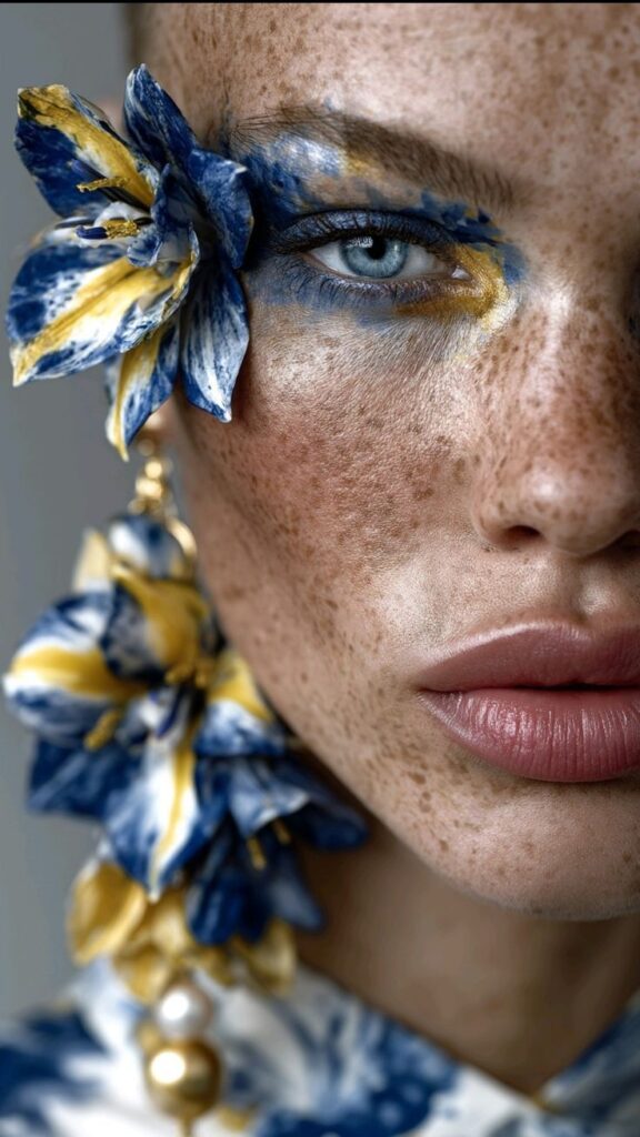 • Η τεχνική: Εφαρμόστε μια σκιά σε έντονο ηλεκτρίκ μπλε, φούξια ή κίτρινο, όχι μόνο στο βλέφαρο, αλλά επεκτείνοντάς την μέχρι τους κροτάφους. Το εφέ πρέπει να μοιάζει με «παρεμβολή» (static) στην οθόνη.
