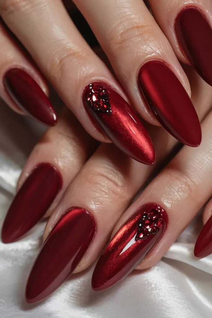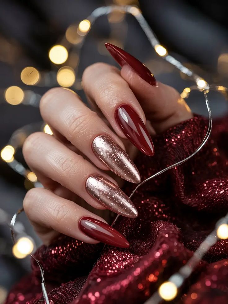 Δεν υπάρχει Πρωτοχρονιά χωρίς κόκκινο. Το βαθύ, βελούδινο κόκκινο -κάτι ανάμεσα σε merlot και ruby- είναι ίσως η πιο glam επιλογή για το ρεβεγιόν. Προσδίδει ένταση, θηλυκότητα και πολυτέλεια, ειδικά σε almond ή squoval σχήμα.