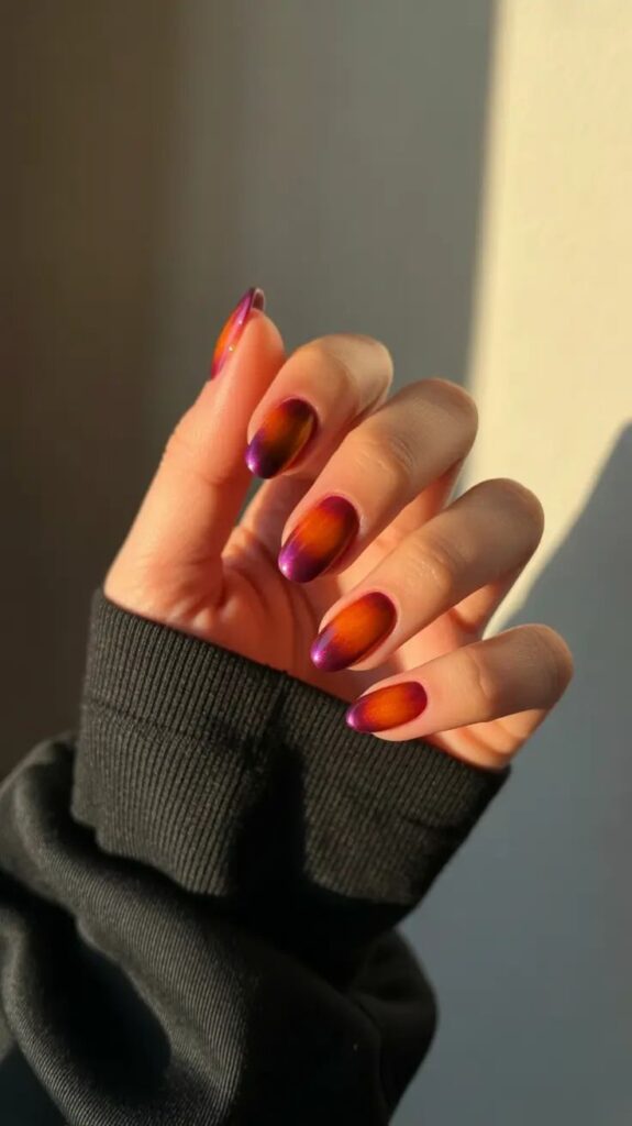 Υπάρχουν μανικιούρ που αγαπάμε για την απλότητά τους, κι άλλα που μας μαγεύουν με τον τρόπο που παίζουν με το φως. Το Ombré με λάμψη Aurora και αποχρώσεις ηλιοβασιλέματος ανήκει στη δεύτερη κατηγορία. Είναι κυριολεκτικά φθινοπωρινή μαγεία σε ένα μπουκάλι – ένα μανικιούρ που αλλάζει χρώμα ανάλογα με το φως, μεταμορφώνοντας τα νύχια σου από απαλά ροζ-χάλκινα σε ιριδίζοντα plum, όπως ακριβώς ο ουρανός λίγο πριν δύσει ο ήλιος.