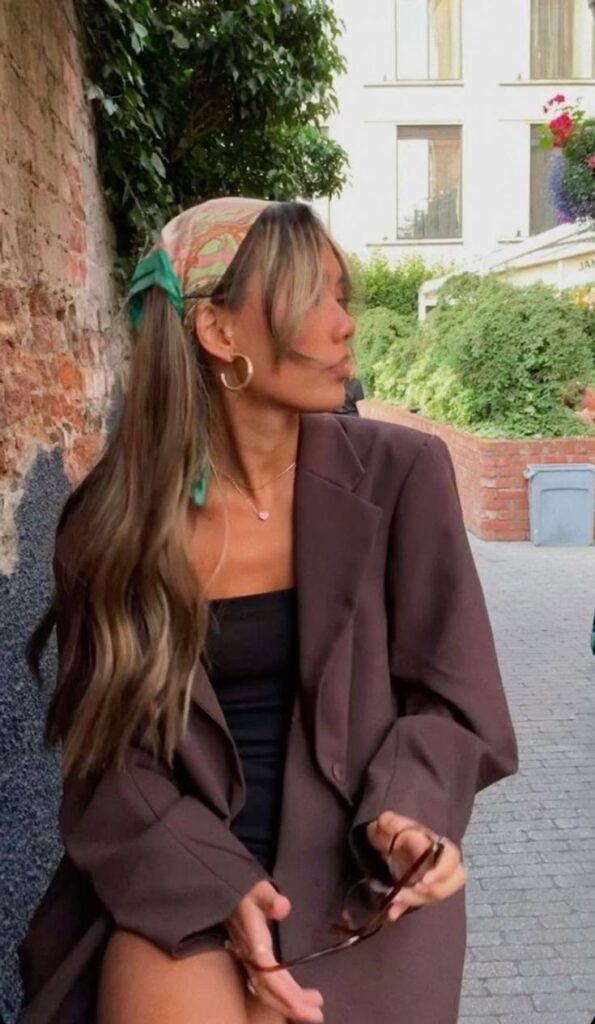 Αυτό το look αποτελεί την επιτομή του “european cool girl” αισθητικής για το 2026. Συνδυάζει την ανδρόγυνη αυστηρότητα ενός oversized σακακιού με τη ρετρό, παιχνιδιάρικη διάθεση μιας πολύχρωμης μπαντάνας και τη διαχρονική πολυτέλεια των χρυσών κρίκων. Είναι το ιδανικό σύνολο για ένα brunch στο Παρίσι, μια βόλτα στις γκαλερί του Βερολίνου ή ένα απόγευμα στο Μιλάνο.