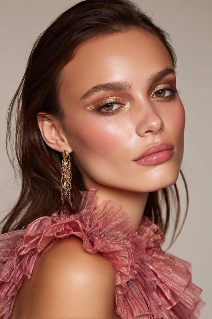 Αν θέλεις να δείχνεις πιο glamorous, επίλεξε rose gold ή champagne shimmer σκιά. Οι μεταλλικές αποχρώσεις “γράφουν” υπέροχα κάτω από το φως και αναδεικνύουν τα ροζ tones του φορέματος χωρίς να φαίνονται υπερβολικές. Είναι το τέλειο look για γάμο, βραδινό ραντεβού ή επίσημη εκδήλωση.Για extra λάμψη, πρόσθεσε λίγη ιριδίζουσα σκιά στο κέντρο του βλεφάρου. Αν έχεις πιο σκούρα μάτια, μπορείς να δώσεις βάθος με bronze ή mocha σκιά στην εξωτερική γωνία.