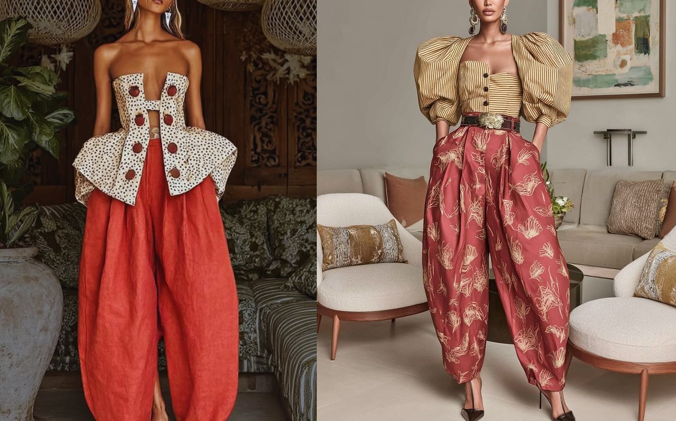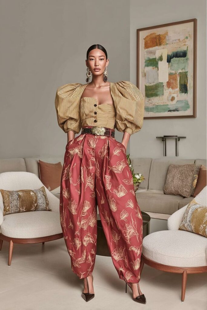 Το μυστικό για να φορέσετε αυτό το look είναι η διαχείριση του χώρου. Η αντίθεση ανάμεσα στον σφιχτό κορσέ και το φουσκωτό παντελόνι δημιουργεί την ψευδαίσθηση μιας πολύ λεπτής μέσης. Είναι ένα σύνολο που δεν χρειάζεται πολλά αξεσουάρ, καθώς οι ίδιοι οι όγκοι του ρούχου λειτουργούν ως statement.