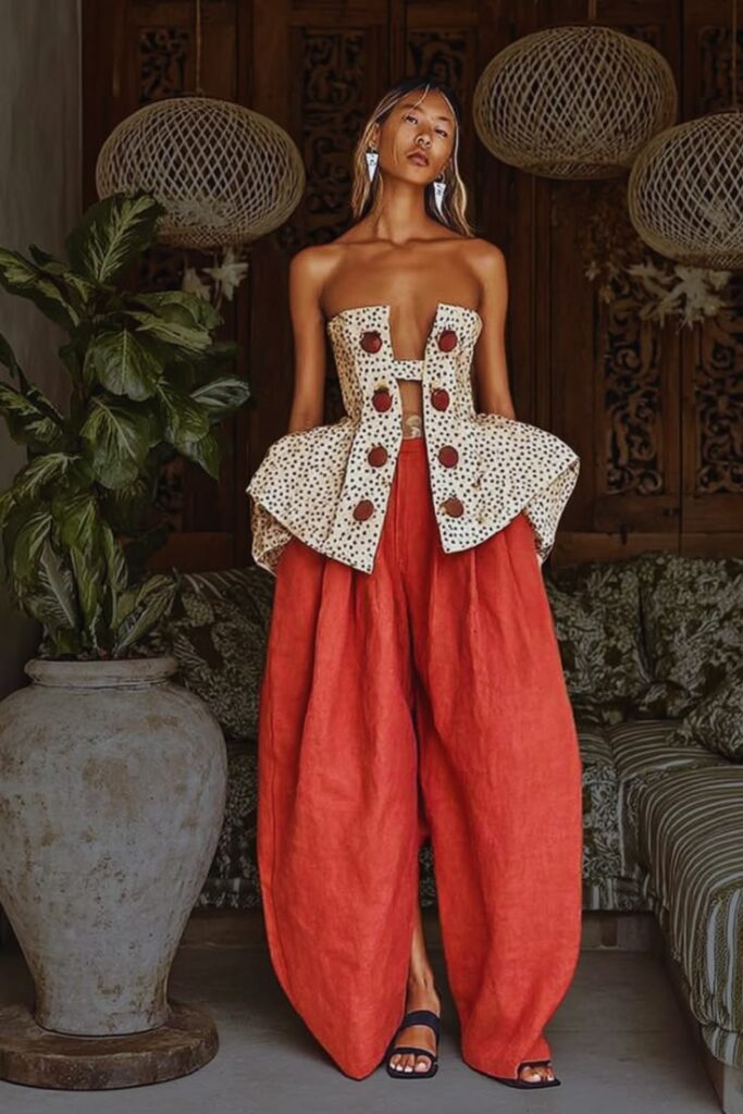 Ο συνδυασμός του πουά κορσέ με το balloon παντελόνι σε χρώμα τερακότας είναι μια πρόταση για τη γυναίκα που θέλει να ξεχωρίζει στις διακοπές της με ένα look που είναι ταυτόχρονα τολμηρό και κλασικό. Είναι η απόδειξη ότι η μόδα του καλοκαιριού μπορεί να είναι δομημένη, εντυπωσιακή και βαθιά καλλιτεχνική.