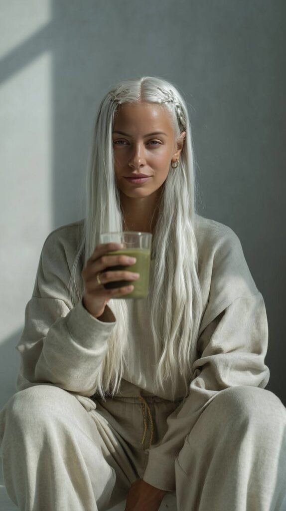 Τα μακριά ασημένια μαλλιά λειτουργούν ως ένας ουδέτερος, φωτεινός καμβάς.