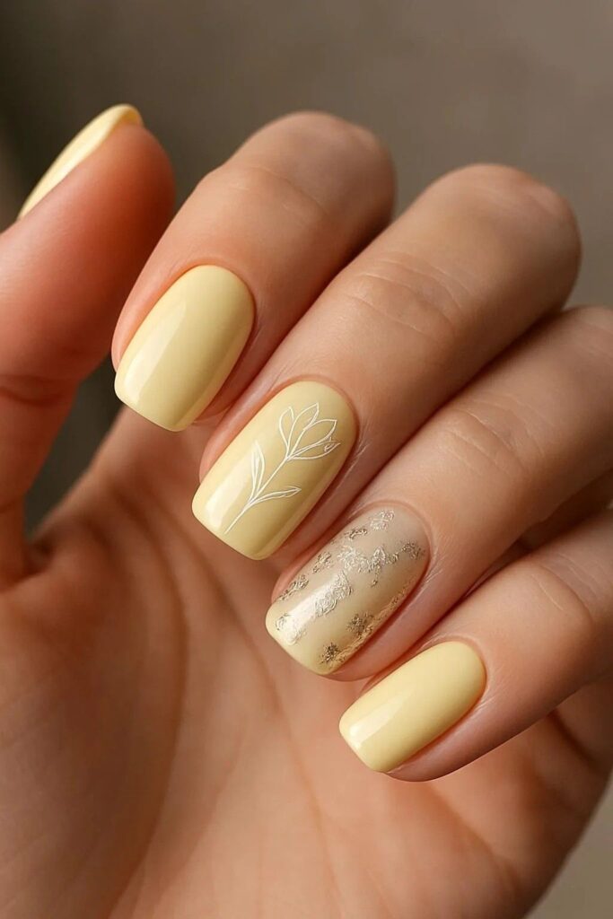 - Matte top coat: Αν θέλετε ένα πιο καλλιτεχνικό και minimal αποτέλεσμα, δοκιμάστε το Butter Yellow με ματ τελείωμα.