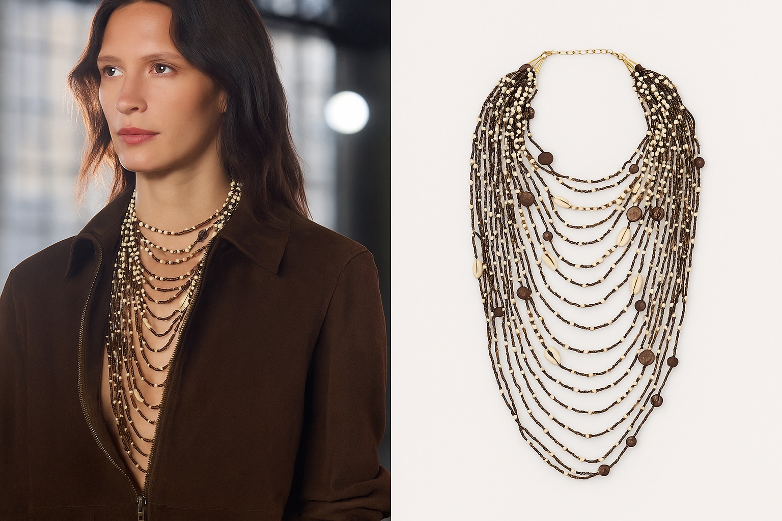 Αν το καλοκαίρι του 2025 είχε ήχο, θα ήταν ο ήχος του κοχυλιού. Και αν είχε κόσμημα-φετίχ, σίγουρα θα ήταν αυτό το πολυεπίπεδο κολιέ από τη Zara. Με περισσότερες από δέκα σειρές λεπτών κορδονιών γεμάτων μικροσκοπικές χάντρες, φυσικά κοχύλια και rustic μεταλλικές λεπτομέρειες, το συγκεκριμένο αξεσουάρ συνδυάζει το tribal με το μοντέρνο και υπόσχεται να απογειώσει ακόμα και το πιο απλό outfit.