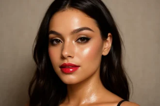 Το απλό μακιγιάζ σε συνδυασμό με κόκκινα χείλη δημιουργεί ένα elegant αποτέλεσμα, ιδανικό για καθημερινές εμφανίσεις.
