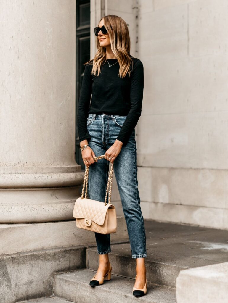 - Jeans, μαύρο ζιβάγκο και puffer jacket + crossbody bag με αλυσίδα = casual αλλά polished.